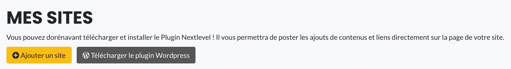 Retour sur NextLevel, sélectionnez votre site et cliquez sur « Actions » puis « Configuration plugin WordPress », vous n’avez plus qu’à coller le token dans la case indiquée. Cliquez sur « Tester la connexion » puis « Enregistrer ».